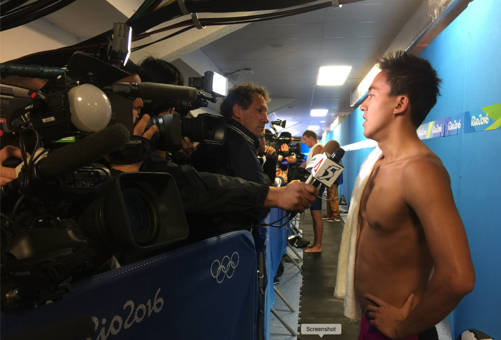 Team Singapore swimmer Quah Zheng Wen speaking with the broadcast team from Mediacorp at the Rio 2016 Olympic Games mixed zone at the swimming venue. The mixed zone is where the media gathers to catch athletes for immediate post competition interviews.