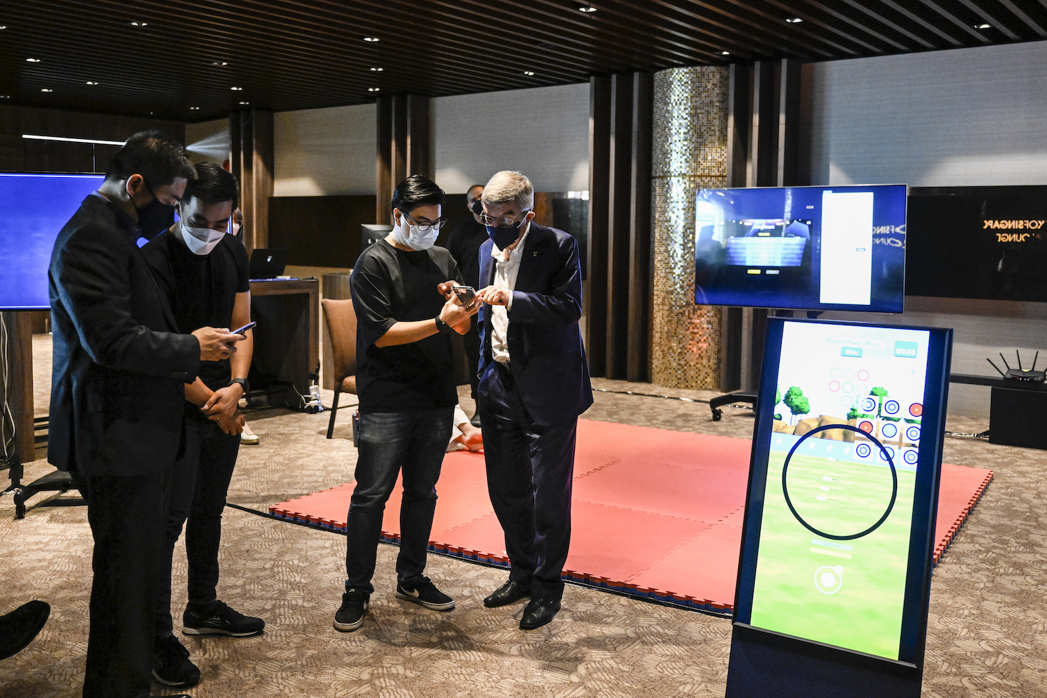 IOC President Thomas Bach, Vice-President Ng Ser Miang and SNOC President Tan Chuan-Jin watching a virtual sport demonstration in Singapore. Photo: Caroline Chia / SNOC